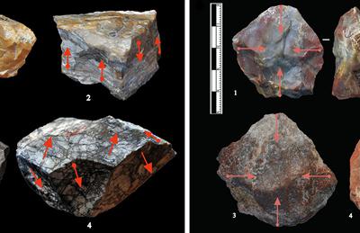 小长梁遗址的锤击(左图)与砸击石核(右图)对比(...