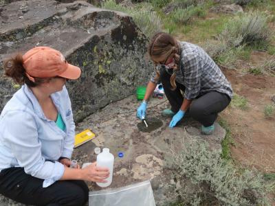 2022年5月,在俄勒冈州中南部的一个考古遗址,人类学家Lisbeth Louderback(左)和...