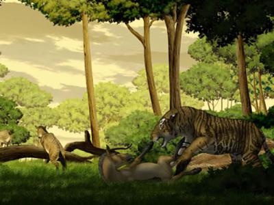 恐剑齿虎头骨化石及其矫正复原(陈瑜绘) 恐剑齿虎捕猎场景(陈瑜绘) 恐剑...