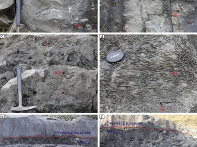 珊瑚层(b-f)及其下伏(a)和上覆(e-f )岩石类型 珊瑚层微相类型:(a) 贵州珊瑚障...