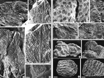 倒卵形格子蕨(Clathropteris obovata)生殖叶片、孢子囊群、孢子囊特征 倒卵形...