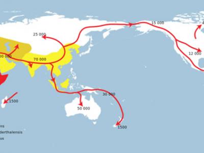 早期人类迁徙地图。智人(红色),穴居人(黄绿色),早期原始人类(黄色)。(中...