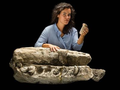 研究学者Alex Boersma站在Albicetus mxymycterus化石标本旁边,手持一颗牙齿。据...