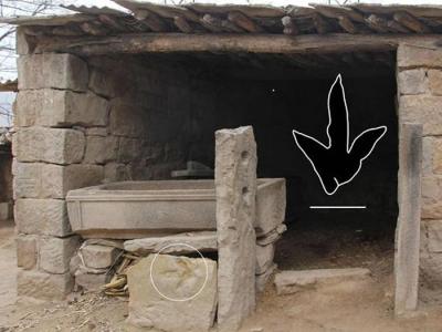 大型剑龙类化石 羊圈挡板上的足迹化石 食槽底部的木化石印痕 化石点 ...