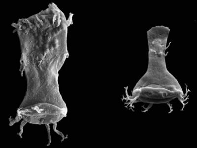 在大灭绝出现的4.2亿年前所累积的海床沉积物中,畸形的几丁虫(左边是异常化石,...
