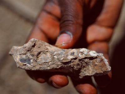 一块哺乳动物头骨化石,牙齿窝里的沉积物,原来是史前蜜蜂筑的巢穴。图片来源:拉萨...