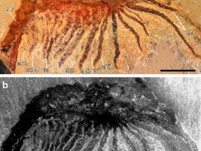外形类似于虾的寒武纪澄江动物群节肢动物。(a)普通光学成像,(b)荧光显微镜成...