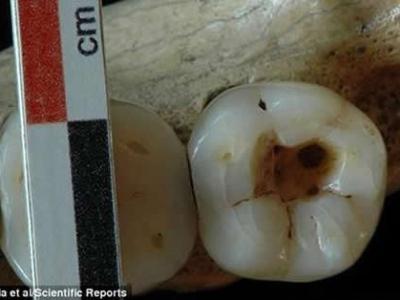 一枚取自一名生活在1.4万年前古人身上的牙齿上留有早期龋齿牙科处理的痕迹。这张...