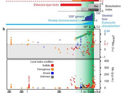 距今7亿年之前的海洋氧化还原状态演变与生物演化 距今6亿年前后沉积物Mo元素含...