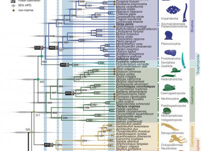 软体动物时间树。(A) 全球生物多样性的时间线主要基于软体动物化石记录的多样性(...