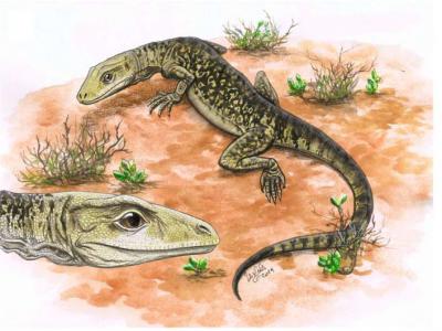 最早的蜥蜴Cryptovaranoides microlanius的复原。图片来源:Lavinia Gandolfi(化石...