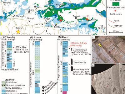 图1 凝灰岩样品的产地与层位图2 凝灰岩中的锆石与SIMS U-Pb年龄(化石...