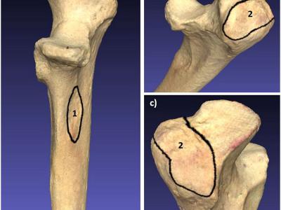 泛穴居人尺骨近端骨骺的三维模型。1=肱肌在尺骨结节上的插入位置;2=肱三头肌在鹰嘴...