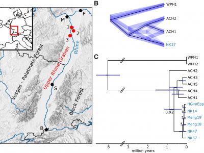莱茵河上游地堑河马化石的地理起源和系统发育关系。图片来源:当代生物学 (2025)...