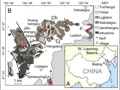 图 1 岩心和露头的地理位置图 2 义县组化石产出单元关系的时空限制和假说(A)两个...