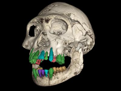 一块哺乳动物头骨化石,牙齿窝里的沉积物,原来是史前蜜蜂筑的巢穴。图片来源:拉萨...