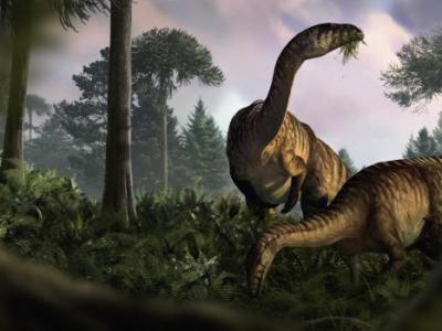 两只蜥脚类恐龙;一只在潮湿的早侏罗世环境中咀嚼新进化的植物,而另一只则抬头仰望...