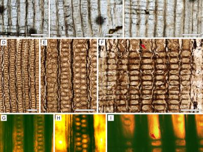 图1. 异木属的解剖学特征,示管胞径壁纹孔和交叉场纹孔特征。A–C,喀左异木(Xeno...
