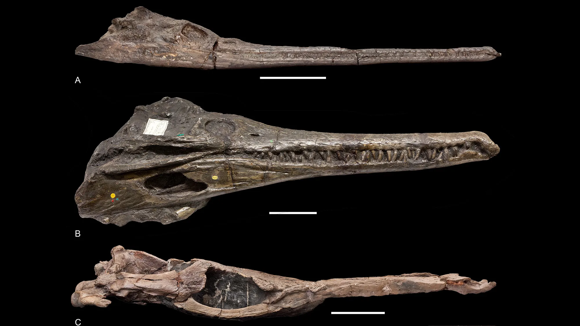 半水栖的thallatosuchian(A和B)的头骨化石,旁边是完全水栖的metriorhynchid头骨...