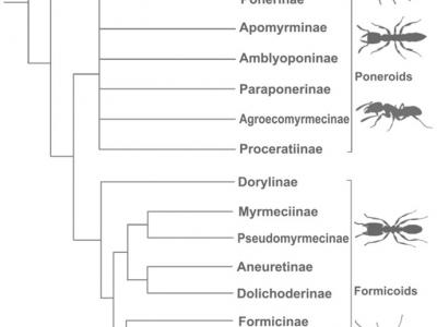 现生蚂蚁各个亚科之间的演化关系,其中火星蚁的系统位置悬而未决系统发育基因组学分...