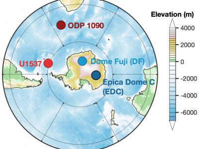 本研究中使用的四个粉尘记录的位置。EDC(深蓝色)在南纬75.1°、东经123.35°钻取...