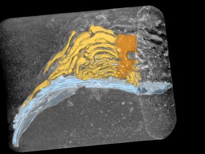 一块哺乳动物头骨化石,牙齿窝里的沉积物,原来是史前蜜蜂筑的巢穴。图片来源:拉萨...