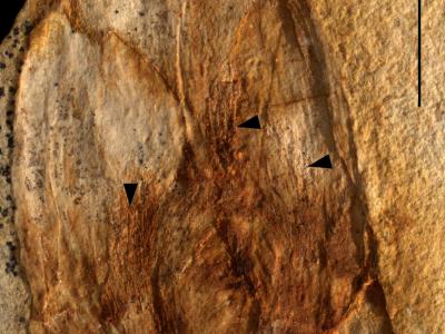 白垩纪古蕾,其中白色三角形所指为雌蕊,黑色三角形所指为可能的雄蕊。比例尺长度5...