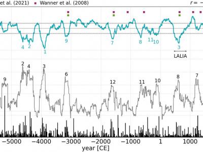 北半球全球平均表面温度(蓝绿色)和气溶胶光学深度(灰色)的200年移动平均值。由...