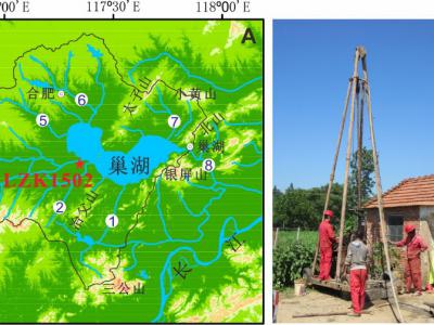 巢湖流域地貌(A)、LZK1502钻孔位置(A、B)及岩芯(C)示意图巢湖LZK1502钻孔优势花粉类...