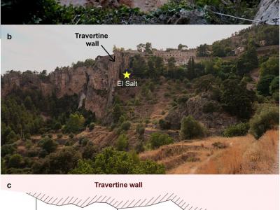 El Salt现场及周边地区的图片。(a) El Salt的全景图,右侧为石灰华墙。(b) El ...