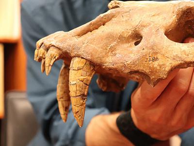 一个剑齿猫Homotherium的头骨,是杰克逊地质学院古脊椎动物收藏的一部分。来源:德...