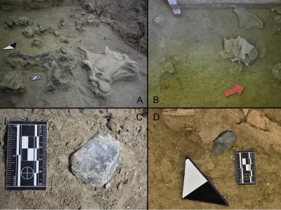 照片来自TT-3。A.在空间上与gomphothere颈椎和颅骨碎片相关的燃烧特征(挖掘单元C5...
