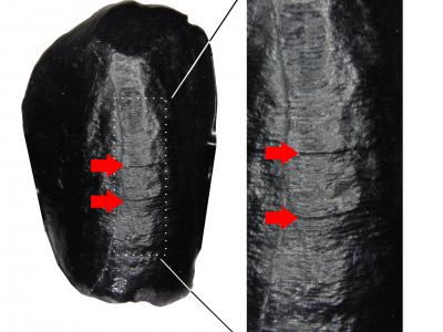尼安德特人牙齿(化石右下犬齿)的高分辨率复制品,红色箭头表示珐琅质发育缺陷/发...