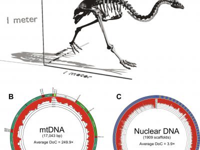 小布什恐鸟的核和线粒体基因组装配草图。(A)小布什恐鸟骨架的3D描绘。(B)重新组装线...