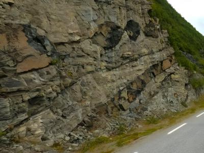 挪威的堤坝切入较老的层状砂岩。来源:Cato Andersen/Mapillary,CC BY-SA(化石网...
