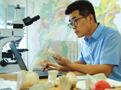 董黎阳在研究化石。秦润嫱在核对资料。郭然为科普活动中获奖小朋友颁奖。山西地质博...
