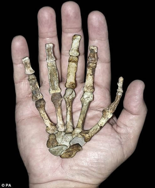 放在现代人手掌里的一个南方古猿源泉种的右手骨骼化石