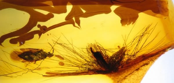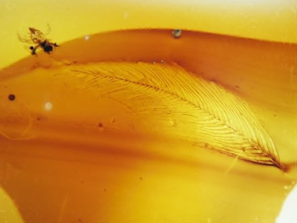 琥珀是数千万年前的树脂被埋藏于地下,经过一定的化学变化后形成的一种树脂化石。此次研究的琥珀中有2到8毫米长的羽毛。大概是在树脂滚落的时候,将羽毛裹在了里面。尽管很小,但还是被精致地保存了下来。
