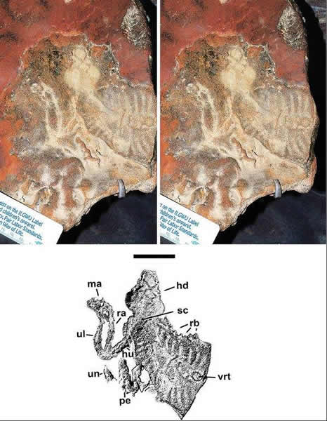 有趣的是,这个化石并非是一具骨架,而是被压扁在泥土里。幼体恐龙的尸体在泥土变硬之前已经些许腐烂,但是头颅和躯干还是完整的保存了下来。
