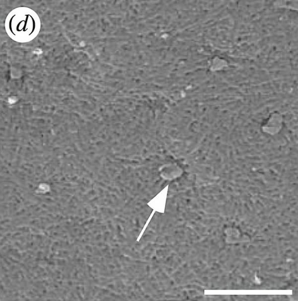 叶甲虫(发现于德国曼塞尔化石坑)标本显微图:利用电子扫描显微镜观察甲虫外壳。箭头指向的是一个小孔。