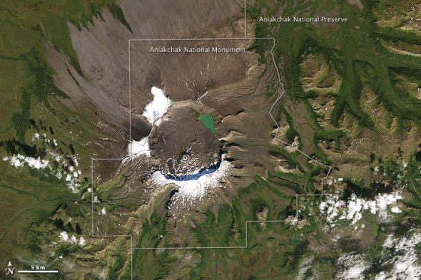 美国宇航局地球资源卫星7号(Landsat 7 satellite)上的增强型主题成像传感器( The Enhanced Thematic Mapper PlUS)于2000年9月15日在阿尼亚查克国家保护区上空拍下了这幅自然色照片。照片中央是火山喷口,其南部边缘在附近斜坡上的积雪和冰层上投下一个蓝灰色阴影。在火山喷口的东北边缘附近有一个湖。火山喷口周围植被稀少,但远处的斜坡上分布者大面积植被。