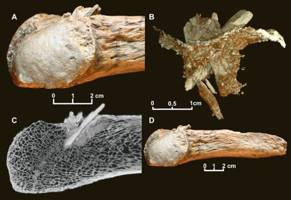 根据一项新研究,对乳齿象肋骨进行的分析发现,美洲原住民使用尖头骨制武器猎杀大型动物的时间要比此前预计提前近1000年。在这组图片中,A为乳齿象肋骨特写照片,D为完整肋骨照片,B为数字还原图,C为X光片。在A和D图,断裂的矛镞仍清晰可见。这件武器由骨头打造,1.38万年前的美洲猎人曾用它猎杀动物。