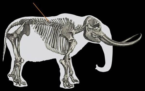 乳齿象图解,展示了古代猎人使用长矛攻击乳齿象时选择的部位。这个长矛的矛尖长度在10到12英寸(约合25到30厘米)之间,穿过乳齿象的组织和肌肉,而后刺入骨头。专家们表示此次打猎出现的时间早于克罗维斯文化。研究领导人沃特斯表示:“在这个狩猎区域,我们进行了年代测定,研究地质特征,并发现了一些文物和其他证据,所有迹象都表明这些猎人生存的年代比克罗维斯人早了近1000年。”