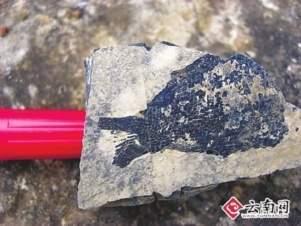 张启跃还记得那天一大早,他和一位同事来到大凹子村附近一座海拔1800多米的山上,他们当天的任务便是搜索大山。他们请了一位村民做向导,就在傍晚快要结束考察时,张启跃在乱石堆里发现了一块印有半条鱼残骸的石头,鱼鳞和鱼鳍清晰可见。他很快在周围的乱石堆里发现了印有鱼前半身的另一块石头,当两块石头拼在一起的时候,一条完整而清晰的鱼出现了。“那时很惊奇,因为以前没见过在灰岩里面保存得如此清晰完整的化石。”