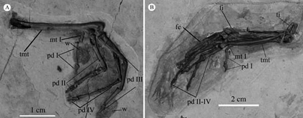 甘肃鸟的后肢骨骼和皮肤印痕(李岩供图)