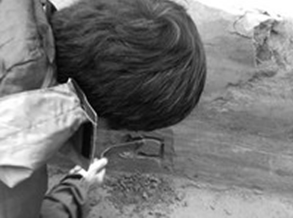 在考察现场记者看到,约两三平方米的斜坡,被塑料布小心翼翼地遮盖起来。侯亚梅说,塑料布下面,“我们怀疑是一枚披毛犀的脚印”。由于坡面土质脆弱,只能先保护起来,再想办法提取、做模型。