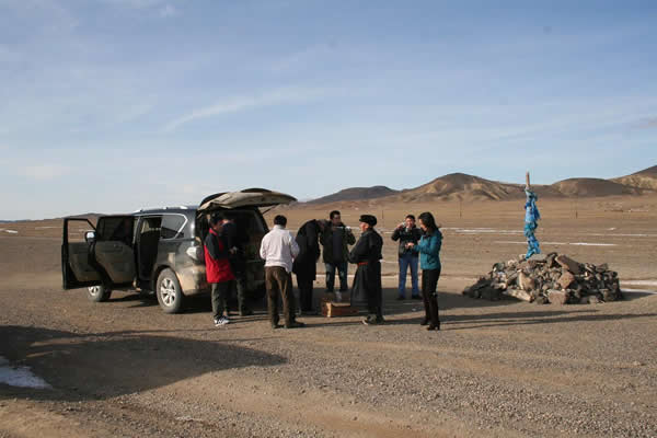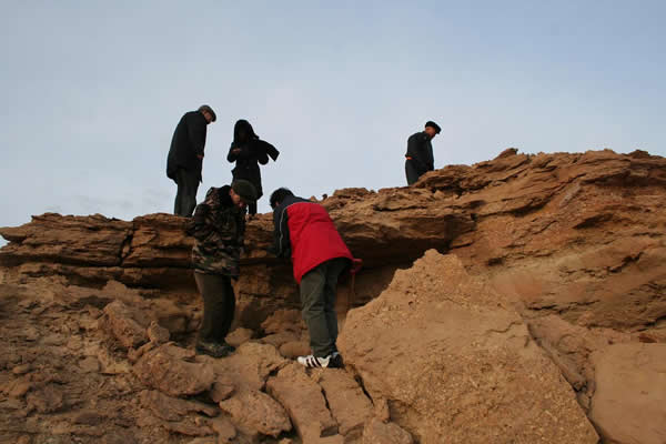 自2011年11月6日(第十三届)中国国际矿业大会上,中国古生物化石保护基金会代表黄新燕副秘书长参加了由国土资源部汪民副部长主持的中蒙双边会谈,并递交了基金会考察报告。此后中国古生物化石保护基金会还应邀参加了中蒙矿产资源合作分委会第四次会议等,中亚科考项目得到主管部门的肯定和支持。经副理事长兼秘书长单华春组织,中国古生物化石保护基金会专家委员会主任徐星推荐,内蒙古自治区地质学会副秘书长、古生物研究所副所长谭琳;沈阳师范大学古生物研究所胡东宇博士、中国古生物化石保护基金会蒙古项目负责人胡建伟一行组成考察团于11月24日奔赴乌兰巴托进行化石现场考察。并于下午17点30分乘车前往乌兰巴托西南1100多公里处的化石发现地,由于雪天路滑,考察团凌晨3点多抵达巴音宏格尔省入住,次日8点继续前往目的地,经过9个小时的路程于25日下午5点抵达化石发现地金丝(音)苏牧150公里处(距阿拉善口岸100多公里)。考察团一行冒着严寒在实地考察并开了现场分析会,会后即连夜返回(于27日凌晨1:30到达)乌兰巴托。