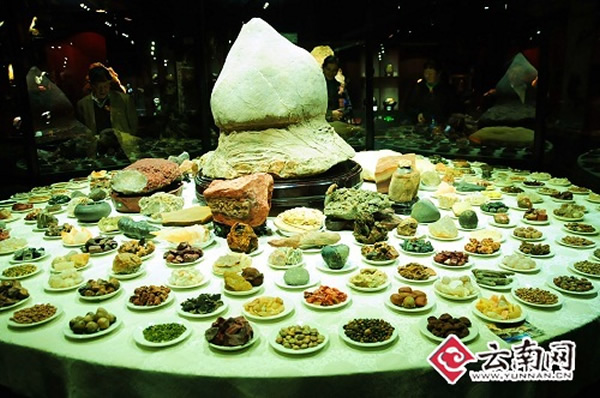 据石林喀斯特地质科研博物馆投资人吴兴建介绍,该馆最炫目的宝贝,是来自广西南丹的一块铁镍陨石,其品质独一无二,如果按市场价来推算的话,这块陨石的价格是黄金的10倍还多。展品猴头化石则是世界上唯一的钟乳石化石,它的出现推翻了考古界形成已久的“钟乳石里不可能产生化石”的论断,其科研价值不言而喻。直径为68厘米的“菊花石王”打破了世界菊花石吉尼斯纪录,成了不折不扣的吉尼斯花王。摆满了216道美味佳肴的“满汉全席”,连“干巴菌”、“火腿”都惟妙惟肖,栩栩如生,让人叹为观止。