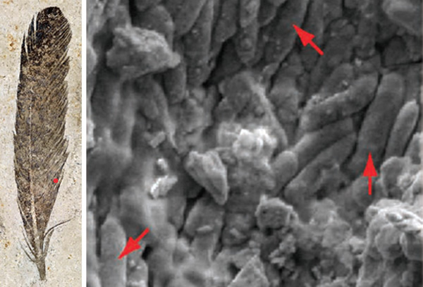 它是这一物种唯一以有机物的形式存留下来的遗迹,而非一个印痕或身体某一部分的铸型。在与各种各样现代鸟类羽毛中的结构进行对比后,研究人员发现,在富含硫的化石中(右箭头所示)保存的此含色素的结构的大小与形状意味着此古代羽毛几乎肯定是黑色的。