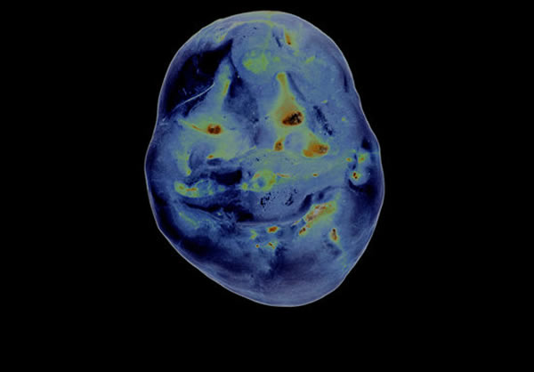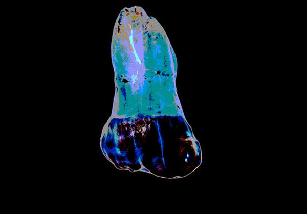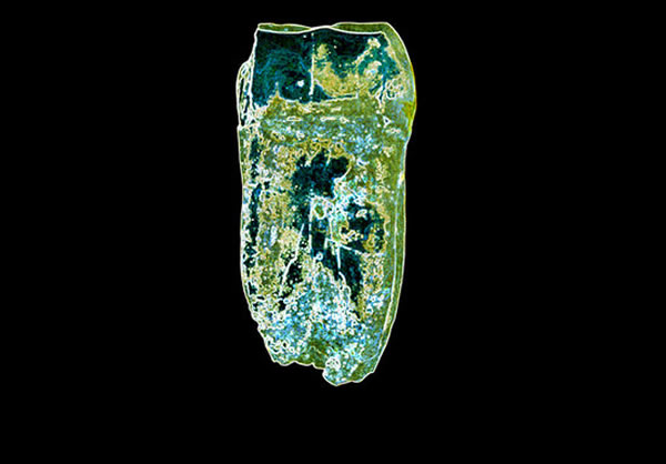 一个年轻尼安德塔人的右下方第三颗磨牙的咬合表面,有一点轻微的表面磨损。